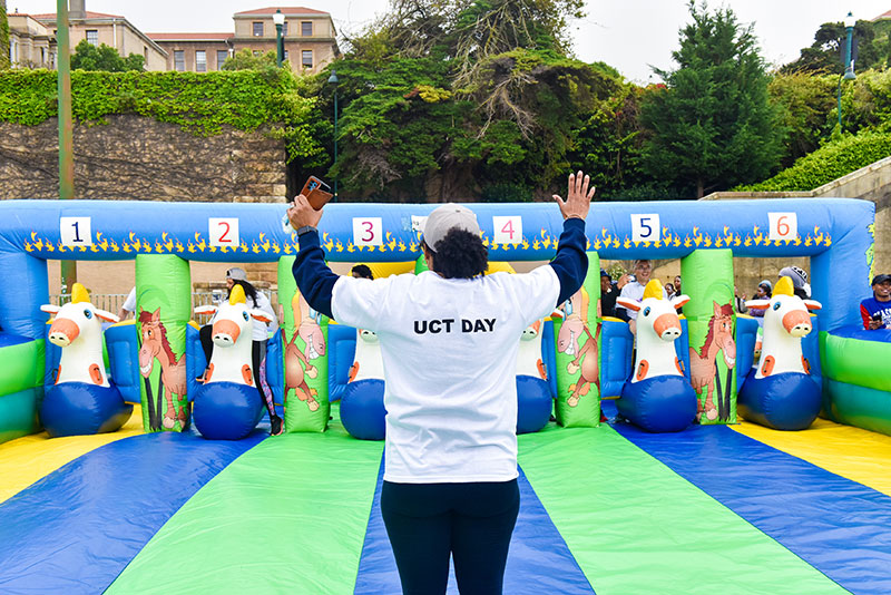 UCT Day. 6 October 2023. The University of Cape Town’s (UCT) lush Green Mile is humming ahead of the inaugural, university-wide carnival. Giant inflatables are ballooning, stalls are going up and food kiosks are rumbling in. It’s a day for connection among staff, students and alumni. But best of all, it’s in aid of four vital student support initiatives: food security, fees, sexual and gender-based violence (SGBV), and wellness.