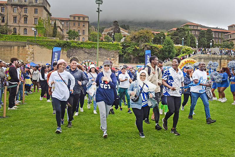 Events start at noon with live music and interviews by UCT Radio, which kicks off with a warm-up session. And even though the weather has turned up as a trio of ugly sisters (call them Wind, Cloud and Frozen), it’s a festival (Bubble Soccer rules), a leveller (here’s looking at you, UCT executive jockeys and three-legged racers), a day of wheeling cartwheels (thank you, young ones), of blue blazers on proud shoulders (yay, the Ikey Tigers, 2023 World University Rugby Invitational Tournament champions who got down to tug of war with the Students’ Representative Council (SRC)), 5 km walkers, pompoms and choreography (yes, for the UCT Cheerleaders), painted faces and tutu-clad way-finders (high fives, BMW-sponsored UCT Amazing Racers).